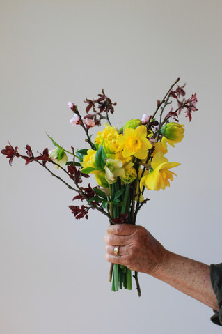 Daffodils, peach tree blossoms, and crab apple foliage make for the perfect early spring bouquet!